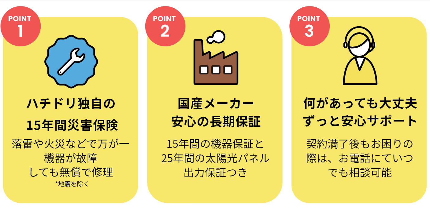 ハチドリソーラー独自の災害補償を準備いたしました。落雷や火災などで万が一故障した際に無償で修理いたします。