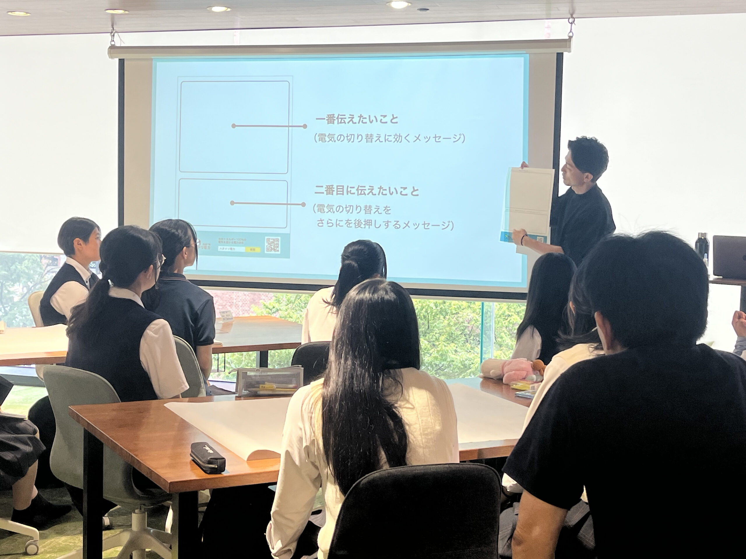 生徒たちは、「電気」を切り口に、社会の仕組みやブランディングの力に触れ、人の心を動かすコミュニケーションとは何か?を本気で考える時間を過ごしました。