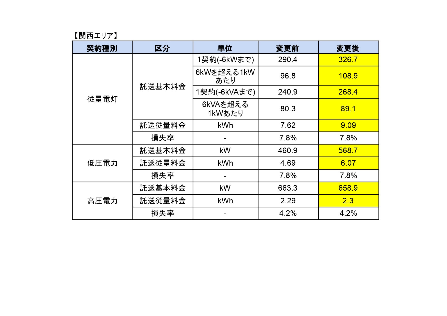 この度、関西電力送配電株式会社による託送料金または損失率の見直しに応じ、2026年4月1日より同額の変更を適用させていただきます。