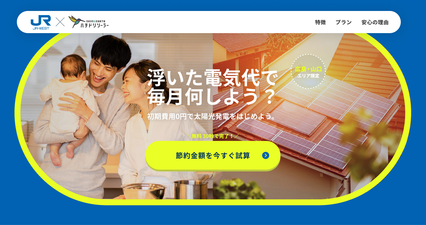 本実証では、駅を中心としたJR西日本の地域ネットワークと、ハチドリソーラーが提供する初期費用0円の住宅向け太陽光サービスを組み合わせ、広島県・山口県のご家庭を対象に太陽光発電の普及を促進し、地域全体の脱炭素化モデルの構築を目指します。
